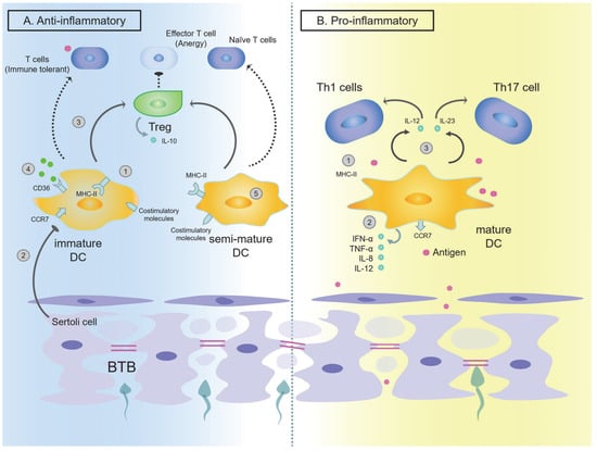 Regulation of testicular DC in physiological conditions (mainly anti-inflammatory) and pathological conditions (mainly pro-inflammatory). (A) Under physiological conditions, the DCs in the testes are mainly immature DCs and semi-mature DCs, maintaining an anti-inflammatory state. ① DCs in normal testes do not lack MHC II or co-stimulatory molecules. Inducing T cell anergy and producing Treg absolutely require the presence of co-stimulatory molecules in DCs ② Sertoli cells lead to downregulation of co-stimulatory molecules on the surface of DCs. ③ DCs in normal testes can induce the production of regulatory T cells (Treg) and together with Treg produce the anti-inflammatory cytokine IL-10. In addition, they secrete T cell development regulator IDO. ④ Immature DCs have strong internalization ability and can take up tissue fragments or apoptotic cells through CD36 or integrin. ⑤ Under physiological conditions, semi-mature phenotype of DCs (which may be the majority in normal testes) expresses MHC II and co-stimulatory molecules, but cannot stimulate the proliferation of naive T cells, but can induce the production of Treg. (B) Under pathological conditions, testicular DCs transform from immature DCs to mature DCs, mainly for pro-inflammatory regulation. ① When DCs are attacked by antigens, the expression of chemokine receptors CCR7 is upregulated and CCR2 is downregulated, which marks DCs transformation into a mature phenotype. ② Mature DCs produce high levels of pro-inflammatory cytokines, such as IFN-α, TNF-α, IL-8 and IL-12. ③ Mature DCs produce IL-12, IL-23. IL-12 is able to predispose activated T cells to differentiate into an inflammatory Th1 phenotype, whereas IL-23 is crucial for terminal differentiation and survival of Th17 cells. (DC: dendritic cell; BTB: blood–testicular barrier; Treg: regulatory T cell).