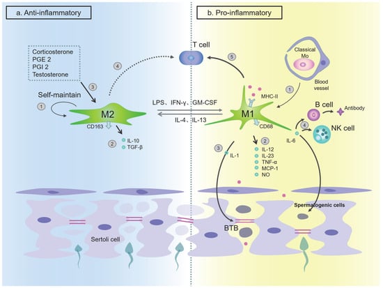 Under physiological conditions, the immunosuppressive M2 macrophages account for the majority of mouse and primate TMs. These macrophages can induce Treg to differentiate, secrete anti-inflammatory factors, and inhibit antigen presentation, and mainly play an immunosuppressive effect. The M1 macrophage plays a traditional immune-promoting function. Researchers have found that changes in the ratio of these two types of macrophages is the key to the fine balance of inflammatory response. M2 macrophages mimic the characteristics of M1 macrophages when inflammation occurs, such as increased expression of CD68 and decreased secretion of IL-10, while M1 macrophages are polarized to M2 macrophages with an increased expression of CD163, high secretion of IL-10, and low secretion of TNF-α by the interstitial fluid (IF) surrounding the TMs in rat testes []. M1 and M2 macrophage have a mutually antagonistic effect to a certain degree and jointly maintain the immune balance of the testes.