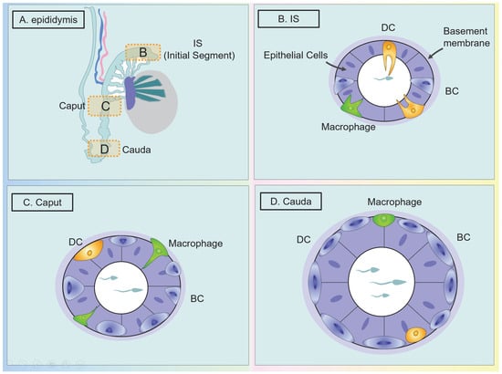 - Mendelsohn, A.C.; Sanmarco, L.M.; Spallanzani, R.G.; Brown, D.; Quintana, F.J.; Breton, S.; Battistone, M.A. From initial segment to cauda: A regional characterization of mouse epididymal CD11c+ mononuclear phagocytes based on immune phenotype and function. Am. J. Physiol. Cell Physiol. 2020, 319, C997–C1010. [Google Scholar] [CrossRef]