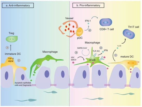 Physiological conditions (mainly anti-inflammatory) and pathological conditions (mainly pro-inflammatory) regulation of epididymal immunity. (a) Under physiological conditions, DCs and macrophages mainly exert immune tolerance effects. ① DCs and macrophages can phagocytose the apoptotic epithelial cells and their fragments. Together, they maintain the integrity of the blood–epididymis barrier (BEB). ② DCs can maintain the immature state through TGF-β signal transduction to maintain immune tolerance. ③ DCs can inhibit the inflammatory response by promoting the differentiation of Treg cells. (b) In pathological conditions (such as inflammation), DCs and macrophages begin to exert pro-inflammatory functions. ① When chronic epididymitis occurs in humans, DCs produce the majority of IL-23, which is believed to play a key role in the terminal differentiation and survival of Th17 cells. ② After the pathogen (such as E. coli) infects the epididymis, the level of MHC II expression increases, and TLR4 and TLR5 on the macrophages are activated, which induce the production of pro-inflammatory cytokines such as IFN through the classical inflammatory signaling NF-κB pathway. ③ The epididymis may serve as a site for the storage and replication of certain viruses (such as HIV and EBOV) when they are infected. However, this does not occur during the invasion of other viruses (such as SARS-CoV). This is related to antigen specificity. ④ pDCs, which are found only in chronic epididymitis, are arranged as clusters around the small vessels or as single cells. It is a special antiviral cell that can rapidly secrete high levels of IFN-I and facilitate and amplify the cytotoxic T cell functions. (DC: dendritic cell; BEB: blood–epididymis barrier; Treg: regulatory T cell).
