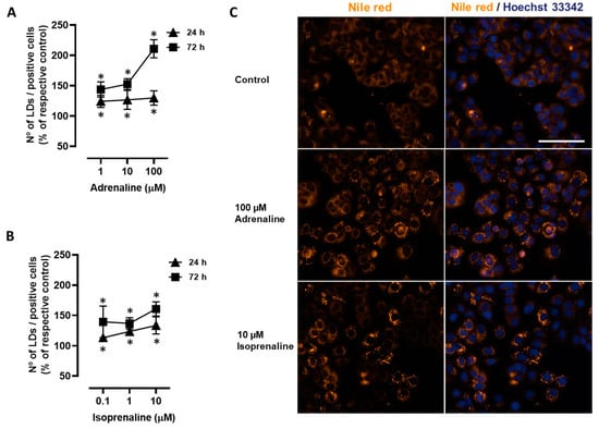 Influence of adrenoceptor activation on the number of lipid droplets (LDs)/positive cells in human MCF-7 breast cancer cells. Cells were treated with either (A) the non-selective adrenoceptor agonist adrenaline (1–100 µM) or (B) the non-selective β-adrenoceptor agonist isoprenaline (0.1–10 µM) for 24 h and 72 h. Results are expressed as percentage of control (solvent) and are presented as mean ± SD from 4−5 independent experiments. * p < 0.05, significantly different from solvent. (C) Representative microscopic images of LDs (orange fluorescence) in MCF-7 breast cancer cells without any treatment and after treatment, for 72 h, with either 100 µM adrenaline or 10 µM isoprenaline. Nuclei (blue fluorescence) were labelled with Hoechst 33342. Scale bar: 100 µm.