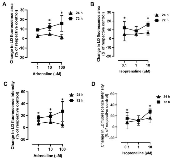 To further dissect the influence of adrenergic activation on the dynamics of LDs, the area and fluorescence intensity of the Nile Red-stained LDs (indicators of LD area and LD neutral lipid content, respectively) were also evaluated. Both adrenaline (1–100 µM) and isoprenaline (0.1–10 µM) induced significant increases in the LD area (Figure 2A,B, respectively) and fluorescence intensity after 72 h of incubation (Figure 2C,D, respectively). The β2-adrenoceptor agonist, salbutamol, failed to change both the area and fluorescence intensity of the LDs at the two incubation periods: the percentage of change in the LD area in the presence of 10 µM salbutamol after the 24 h incubation period was 3.4 ± 3.0%, whereas after the 72 h incubation period, it was 2.9 ± 5.7%; the LD intensity after the 24 h incubation period was 5.4 ± 4.6%, whereas after the 72 h incubation period, it was 7.7 ± 13.1% (Figure S2A,B, respectively).