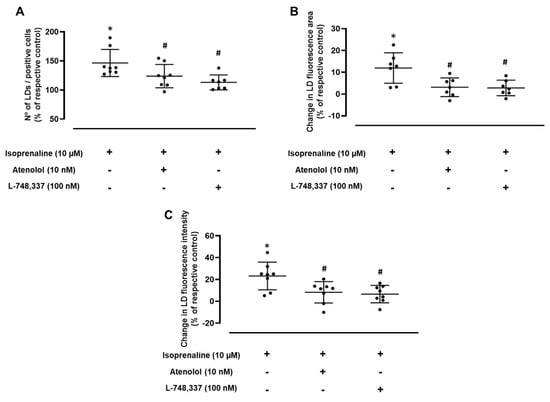Influence of the selective β1-adrenergic receptor antagonist atenolol (10 nM) and the selective β3-adrenergic receptor antagonist L-748,337 (100 nM) on the effect caused by isoprenaline (10 µM) on (A) the number of lipid droplets (LDs)/positive cells, (B) their area and (C) their Nile Red fluorescence intensity after 72 h of incubation. Results are expressed as percentage of control (solvent) and are presented as mean ± SD from 7−8 independent experiments. * p < 0.05, significantly different from solvent; # p < 0.05, significantly different from isoprenaline treatment.