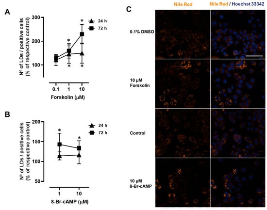 To examine whether cAMP is involved in β-adrenoceptor-mediated LD expansion, MCF-7 cells were incubated with forskolin, which increases intracellular cAMP levels by directly activating adenylyl cyclase. As observed with the adrenaline and isoprenaline, forskolin (0.1–10 µM) also caused a significant time-dependent increase in the number of LDs/positive cells in MCF-7 cells (Figure 4A). An identical experimental approach was performed using the cell-permeable stable cAMP analogue, 8-Br-cAMP. As shown in Figure 4B, 8-Br-cAMP (1–10 µM) also led to a significant increase in the number of LDs/positive cells (only at the 72 h incubation period). Representative images of Nile Red- and Hoechst 33342-stained MCF-7 cells treated with either forskolin or 8-Br-cAMP are shown in Figure 4C.