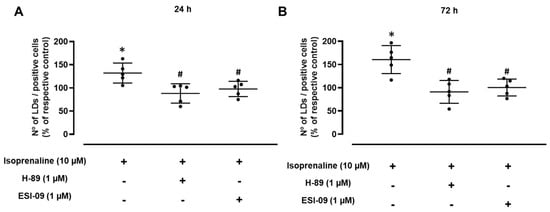 To investigate the involvement of PKA in β-adrenoceptor-mediated LD expansion, cells were treated with isoprenaline (10 µM) in the presence of H-89 (1 µM), a PKA inhibitor. As shown in Figure 5, in the presence of H-89, isoprenaline failed to alter the number of LDs/positive cells after both 24 and 72 h incubation (Figure 5A,B, respectively). The putative involvement of EPAC proteins in the mechanism of LD expansion caused by isoprenaline was also investigated. For this purpose, isoprenaline (10 µM) was tested in the presence of ESI-09 (1 µM), a non-selective inhibitor of EPACs. In the presence of ESI-09, isoprenaline failed to cause any changes in the number of LDs/positive cells after both the 24 and 72 h incubation periods (Figure 5A,B, respectively). Taken together, these results indicate the involvement of both PKA and EPAC proteins in the increase in the number of LDs caused by β-adrenoceptor activation.
