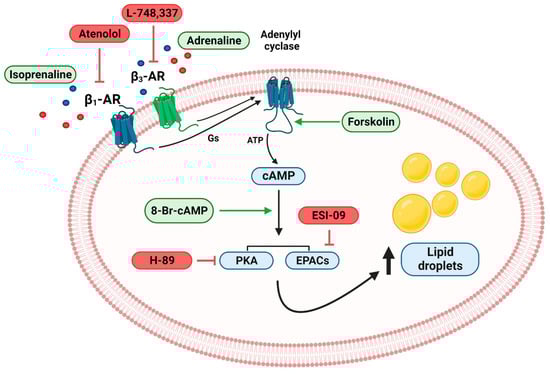 Canonically, β1- and β3-adrenoceptors are receptors coupled to cAMP signal transduction pathways []. cAMP pathways require adenylyl cyclase activation, the subsequent formation of cAMP and the activation of cAMP target proteins []. In the present study, the adenylyl cyclase activator forskolin caused LD expansion, supporting the involvement of cAMP in LD expansion. Similar effects of forskolin in LD expansion have been previously reported, namely, in pre-adipocytes [] and meibocytes []. The involvement of cAMP in the β-adrenoceptor-mediated LD expansion was also confirmed by the use of the metabolically stable cAMP analogue, 8-Br-cAMP. The pattern of effects caused by 8-Br-cAMP was not surmountable with those observed by the direct stimulation of adenylyl cyclase, indicating that the cAMP regulation of LD dynamics may be conditioned by the metabolic stability of cAMP.