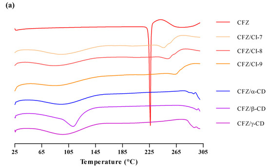 The encapsulation efficiencies (EEs) of the inclusion complexes of CFZ with CIs and CDs ranged from 50.8 ± 4.52% to 91.9 ± 1.44%, revealing significant differences (Figure 2b). The highest EE (91.9%) was obtained with the CFZ/CI-9 complex, with a CFZ:CI-9 molar ratio of 0.2:1, while the lowest EE (50.8%) was observed in the case of the CFZ/α-CD complex, with a CFZ:α-CD molar ratio of 0.01:1. The differences in EE could be attributed to various factors, including the chemical structure and physical properties of the guest molecule, the type of interaction between CFZ and the CIs or CDs, and the procedure used to synthesize the complexes. According to their EEs, the CFZ/CI and CFZ/CD complexes had the following relationship: CFZ/CI-9 > CFZ/CI-8 > CFZ/β-CD > CFZ/CI-7 > CFZ/γ-CD > CFZ/α-CD. The results suggest that there are favorable interactions between CI-9 and molecules with chlorophenyl group and –NH functions. On the other hand, CI-7, α-CD, and γ-CD showed unfavorable interactions with CFZ. These findings are consistent with those reported by de Castro et al., (2020), who investigated EE and clathrate complexes at a molar ratio of 1:7 based on the complexes of CFZ and β-CD derivatives by applying the methods of spray-drying and freeze-drying [10].