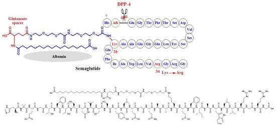 - Lau, J.; Bloch, P.; Schäffer, L.; Pettersson, I.; Spetzler, J.; Kofoed, J.; Madsen, K.; Knudsen, L.B.; McGuire, J.; Steensgaard, D.B.; et al. Discovery of the Once-Weekly Glucagon-Like Peptide-1 (GLP-1) Analogue Semaglutide. J. Med. Chem. 2015, 58, 7370–7380. [Google Scholar] [CrossRef]