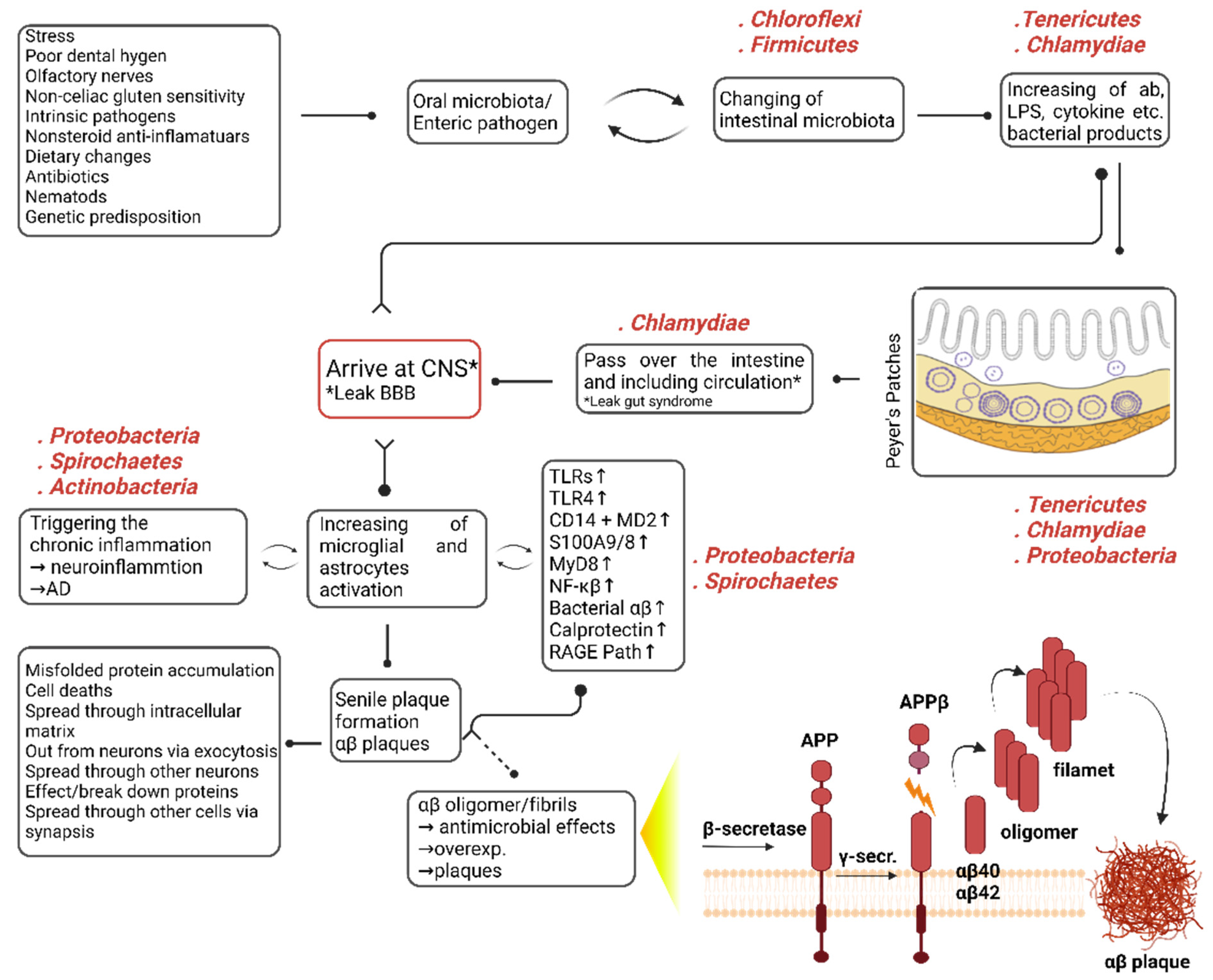 - Bhattacharjee, S.; Lukiw, W.J. Alzheimer’s disease and the microbiome. Front. Cell. Neurosci. 2013, 7, 153. [Google Scholar] [CrossRef]