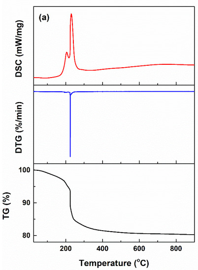 The dried precipitates and gel were subjected to thermal analysis up to 900 °C to identify the appropriate calcination temperatures (Figure 1). Figure 1a displays the resulting curves in the case of the CeO2 intermediate, for which a single main step of weight loss of approximately 9.3%, centred at 224 °C, can be observed. According to the DSC curve, no endothermic effect assigned to Ce(OH)4 dehydroxylation can be identified, but a complex asymmetric exothermic effect is present in the range of 150–280 °C. The latter can be attributed to CeO2 crystallization, which occurs concomitantly with the dehydroxylation process, this being integrated in the final effect. The total mass loss from room temperature to 900 °C is around 19.7%, while up to 500 °C is around 19.1%, meaning that the application of a calcination treatment at 500 °C will ensure the removal of most residues and chemically bound water, together with CeO2 crystallization.