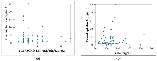 To date, there has been no accurate description of the mechanism by which PENK A levels increase in renal diseases. Glomerular filtration usually allows the passage of small, non-protein-bound molecules into renal tubules; however, there has been no published evidence of PENK A excretion in urine that could validate the data on its renal clearance. The proposed explanation of elevated PENK A levels in renal diseases implicates impaired clearance or upregulation [14,20]. This would imply the accumulation of PENK A in CKD and ESKD, proportionally to the degree of impaired kidney function, whilst our study proved that, in patients with ESKD, PENK A did not reflect kidney function. In this cohort, we did not observe the correlation of PENK A level with creatinine, urea, or residual urine output, which are parameters that represent the reference method to assess the degree of kidney dysfunction.