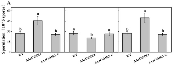 To assess the function of AaCaMKs in A. alternata, the gene deletion mutants, ΔAaCaMK1, ΔAaCaMK2, ΔAaCaMK3 and complementary strains ΔAaCaMK1-C, ΔAaCaMK2-C and ΔAaCaMK3-C were obtained by homologous recombination and PEG-mediated protoplast transformation. The wild-type (WT), ΔAaCaMKs and the complementary strain ΔAaCaMKs-C spore and hyphae morphology on PDA at 3, 5 and 7 days of incubation revealed that the colony morphology and growth of these strains were comparable (Figure 1A,B). However, ΔAaCaMK1 and ΔAaCaMK3 mutants produced a large number of conidia, 2-fold higher than WT, whereas the conidia produced by ΔAaCaMK2 mutant was 24% less than WT (Figure 2A). Compared to the WT strain, the single deletion AaCaMKs recorded a significantly reduced biomass accumulation after 5 d of incubation (Figure 2B). However, sporulation and biomass accumulation defects were rescued in ΔAaCaMKs-C strains. These results implied that the deletion of the AaCaMKs gene had no significant effect on the A. alternata growth; rather, it was involved in the sporulation and biomass accumulation.