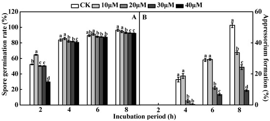 The A. alternata appressorium (A) and infection hyphae (B) formation on intact pear epidermis. Vertical lines indicate standard error (±SE). Different letters indicate significant differences (p < 0.05).