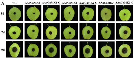 For the pear infection assay, the pear fruits were disinfected using 1% sodium hypochlorite for 2 min, and three wounds were uniformly inflicted on the equator of each pear using sterile punching nails (3 mm in diameter and 5 mm in depth). Next, 20 µL of WT, ΔAaCaMKs and ΔAaCaMKs-C spore suspensions were inoculated into each wound. The pear fruits were then placed in plastic boxes and stored at room temperature. The lesion diameter was measured at 3, 5, 7 and 9 d after inoculation. Each treatment had nine fruits replicated three times.