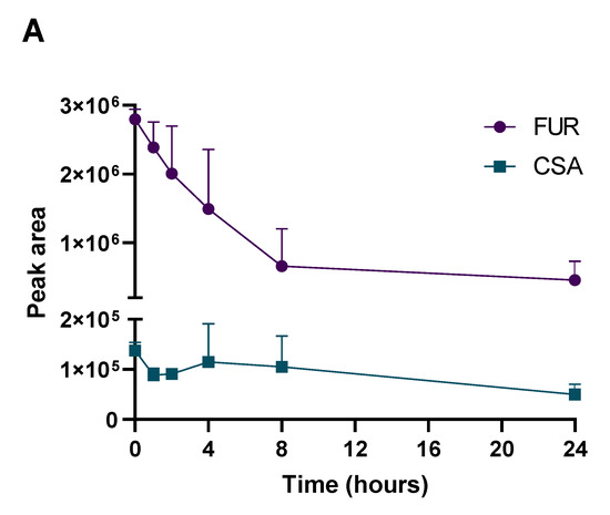 Pharmacokinetic plots of furosemide (FUR) panel (A), carbamazepine (CBZ) panel (B) and chlorpromazine (CPZ) panel (C). The analysis of drugs and the corresponding metabolites was performed at different time points (0, 1, 2, 4, 8 and 24 h post-treatment).