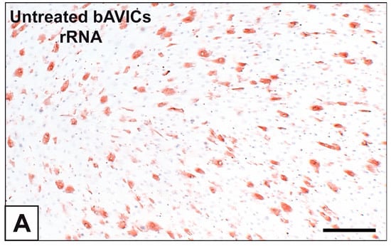 Primary cultures of bAVICs were obtained as previously described [33,36,37,38]. Bovine hearts were retrieved at slaughtering in a local abattoir (Salumificio Pitaccolo, Castions di Strada, Udine, Italy) respecting the protection of animals at the time of killing (Reg. CE 1099/2009, 24 September 2009). Cows were not killed specifically for the purpose of the present study and no experiments were performed on them before slaughtering. bAVICs were seeded onto 24 × 24 mm cover glasses placed into 35 × 10 mm Petri dishes and cultured for 9, 15, 21, and 28 days either under normal conditions (control) in Dulbecco’s Modified Eagle’s Medium (DMEM; Sigma-Aldrich, St. Louis, MO, USA) plus 10% fetal bovine serum (FBS; Gibco, Waltham, MA, USA) or pro-calcific conditions in DMEM (Sigma-Aldrich, St. Louis, MO, USA), plus 10% FBS (Gibco, Waltham, MA, USA), plus 2.0 mM inorganic phosphate, plus 100 ng/mL lipopolysaccharide from E. coli (LPS; Sigma-Aldrich, St. Louis, MO, USA), plus 1/5 (v/v) of conditioned medium obtained from LPS-stimulated bovine macrophages [33,36,37,38]. For conditioned medium preparation, bovine blood was collected by a veterinarian during routine care with respect for normal animal behavior and wellness, according to the professional ethics of FNOVI (Federazione Nazionale Ordini Veterinari Italiani) approved on 12 June 2011. Both culturing and stimulating media were refreshed every 3 days. All cultures were prepared in triplicate (n = 3).