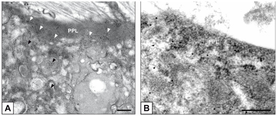 Semithin sections of Epon-embedded bAVIC cultures as well as pAVL and hAVL samples were incubated with 1% silver nitrate for 15 min under direct sunlight, keeping glass slides on a plate warmed at +80 °C. After rinsing with distilled water, semithin sections were incubated, warm, with 5% sodium thiosulfate for 5 min. Top-less conic BEEM capsules were then glued onto the glass slides, so encircling each reacted semithin section, and filled with fluid Epon resin for section re-embedding. Ultrathin sections were collected onto formvar-coated 2 × 1-mm-slot copper grids and weakly contrasted with uranyl acetate and lead citrate. Observations and image recording were made using the Philips CM12 STEM electron microscope as above.