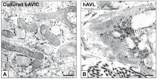 Cell cultures, as well as pAVL and hAVL samples, were fixed with 2.5% glutaraldehyde diluted in 25 mM sodium acetate/acetic acid buffer, pH 4.8, containing 0.05% phthalocyanine cuprolinic blue (Electron Microscopy Sciences, Hatfield, PA, USA) and 0.05 M magnesium chloride, overnight at room temperature under constant stirring. Following this, bAVIC cultures and AVL samples were: (i) post-fixed with 2% osmium tetraoxide (Agar Scientific, Stansted, Essex, UK), (ii) dehydrated with graded ethanol solutions, and (iii) embedded into Epon 812 resin or Epon-Araldite resin, respectively. Ultrathin sections were collected onto formvar-coated 2 × 1-mm-slot copper grids and contrasted with uranyl acetate and lead citrate. Observations and photographic recording were undertaken using a CM12 STEM transmission electron microscope (Philips, Eindhoven, The Netherlands).