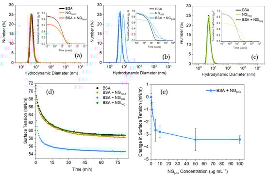 Interaction study of (a) neutral (NGneut), (b) positively (NGpos), and (c) negatively (NGneg) charged nanogels with 35 mg mL −1 BSA (black) by DLS (number distribution). (d) Dynamic surface tensiometry of NGneut (orange), NGpos (blue), and NGneg (green) in presence of 100 μg mL−1 BSA compared to the pure protein (black). (e) Equilibrium surface tension values for BSA (100 μg mL−1) with increasing concentration of NGpos (0–100 μg mL−1). All measurements were conducted in PBS (10 mM, pH = 7.4) at 25 °C.