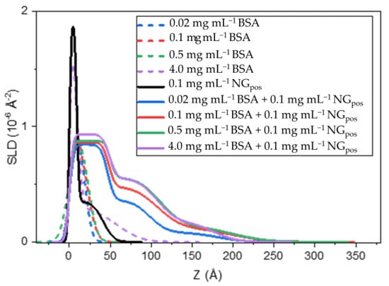 SLD profiles of BSA (dashed lines), NGpos (black), and BSA-NGpos mixtures (solid lines) at the air/water interface in CMAir contrast. BSA was used in concentrations between 0.02–4 mg mL−1, while NGpos was kept at 0.1 mg mL−1. The NGpos is made of 60 molar% d3AM—20 molar% MBA—20 molar% GUA.