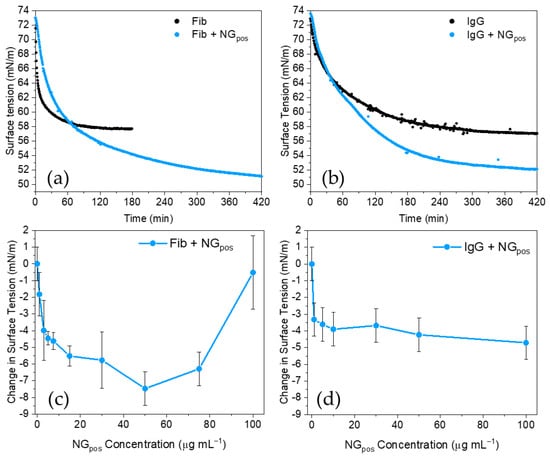 Protein corona studies of NGpos with model proteins Fib and IgG. Dynamic surface tension plots for NGpos (50 μg mL−1) with: (a) Fib, or (b) IgG. Change in equilibrium surface tension of protein samples as a function of the concentration of NGpos are presented for: (c) Fib, and (d) IgG.