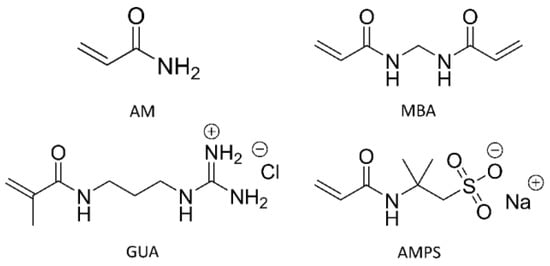 Three acrylamide-based nanogels were synthesized using HDRP, a method which allows the control of nanogels’ size and polydispersity without the need for surfactants []. Acrylamide (AM) and N,N′-methylenbisacrylamide (MBA) were chosen as a backbone monomer and a crosslinker, respectively (Scheme 1). AM was chosen because of its higher hydrophilicity, with the expectation of yielding non-active nanogels. All nanogels were synthesized with crosslinker (MBA) content fixed at 20 mol%, which is the percentage of moles of crosslinker based on the total moles of monomers in the formulation, as it was previously shown to lead to a matrix with good drug loading properties, suitable for drug delivery applications [,]. Charged nanogels were obtained by adding 20 mol % of GUA or AMPS to the formulation, to ensure a strong surface charge was available on the NP.