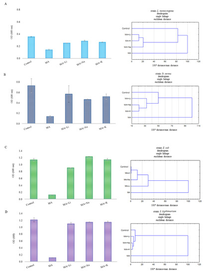 OD value on the last day of cultivation using Bioscreen C Pro (left) and dendrograms (right) for (A) L. monocytogenes ATCC 13932, (B) S. aureus ATCC 25923, (C) E. coli ATCC 25922, (D) S. typhimurium ATCC 14028, (E) B. subtilis ATCC 6633, (F) L. backii KKP 3566, (G) C. albicans ATCC 10231, and (H) R. mucilaginosa KKP 3560 in the presence of MA (5 mg/mL) and its salts (5 mg/mL). Control means the strain without any antimicrobial agent.