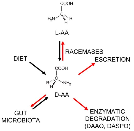 Metabolism of D-amino acids in the human body. Black arrows: synthetic pathways; red arrows: degradation/elimination pathways. L-AA = L-amino acid; DASPO = D-aspartate oxidase.