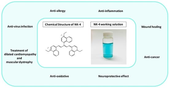 NK-4 plays a key role in the treatment of various diseases, such as in hay fever to expect anti-allergic effects, in bacterial infections and gum abscesses to expect anti-inflammatory effects, in scratches, cuts, and mouth sores from bites inside the mouth for enhanced wound healing, in herpes simplex virus (HSV)-1 infections for antiviral effects, and in peripheral nerve disease that causes tingling pain and numbness in hands and feet, while NK-4 is used also to expect antioxidative and neuroprotective effects. We review all therapeutic directions for the cyanine dye NK-4, as well as the pharmacological mechanism of NK-4 in animal models of related diseases. Currently, NK-4, which is sold as an over-the-counter drug in drugstores, is approved for treating allergic diseases, loss of appetite, sleepiness, anemia, peripheral neuropathy, acute suppurative diseases, wounds, heat injuries, frostbite, and tinea pedis in Japan. The therapeutic effects of NK-4’s antioxidative and neuroprotective properties in animal models are now under development, and we hope to apply these pharmacological effects of NK-4 to the treatment of more diseases. All experimental data suggest that different kinds of utility of NK-4 in the treatment of diseases can be developed based on the various pharmacological properties of NK-4. It is expected that NK-4 could be developed in more therapeutic strategies to treat many types of diseases, such as neurodegenerative and retinal degenerative diseases.