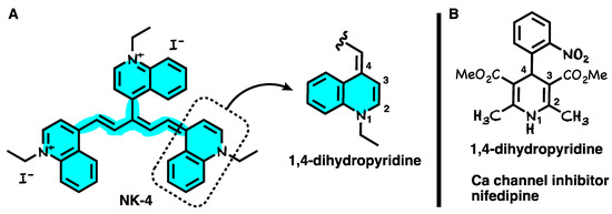 (A) Chemical structure of NK-4 having a 1,4-dihydropyridine moiety. (B) Structure of Ca channel inhibitor nifedipine having a 1,4-dihydropyridine moiety.