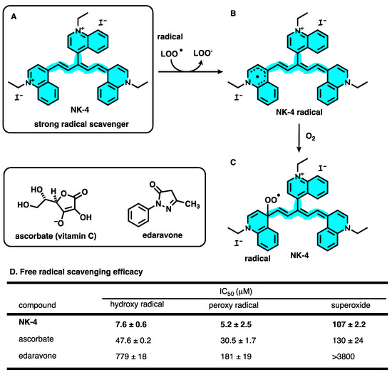 (A) Chemical structure of NK-4. (B) Structure of NK-4 radical. (C) NK-4 peroxy radical generated by O2. (D) Free radical scavenging efficacy.