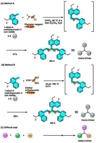 The synthetic route for NK-4 is shown in Figure 4 [,]. 1-Ethyl-4-methylquinolin-1-ium iodide was treated with Vilsmeier reagent generated in situ from P(O)Cl3 and N,N-dimethylformamide, affording the desired NK-4 at a 41% yield (Figure 4A). A different C1 unit protocol was also reported (Figure 4B). However, these routes could be used for the same three-quinoline moiety, but not for hetero-quinoline moieties. In the future, the development of a new synthetic methodology is highly required to supply various derivatives which have different quinoline cores (Figure 4C).
