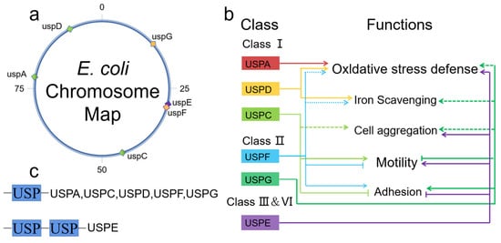 In 1992, Nyström and Neidhardt [] identified a protein in Escherichia coli that was overexpressed under stressful conditions and named it Universal Stress Protein (USP) [,]. The USP was shown to play an important role in various [] aspects of phosphorylation [] and coordination of glucose [] and acetate metabolism in E. coli []. After the amino acid sequence of the first USP was determined in E. coli [], USPs were identified in a range of organisms [,]. The E. coli USP gene family includes UspA, UspC (YecG), UspD (YiiT), UspE (YdaA), UspF (YnaF, UP03) and UspG (YbdQ), and they have been divided into three subfamilies (Figure 1a) []. Various E. coli USPs play different roles in this bacterium [] and can be divided into two major classes (Figure 1b) and four minor subclasses (Figure 1c) [].
