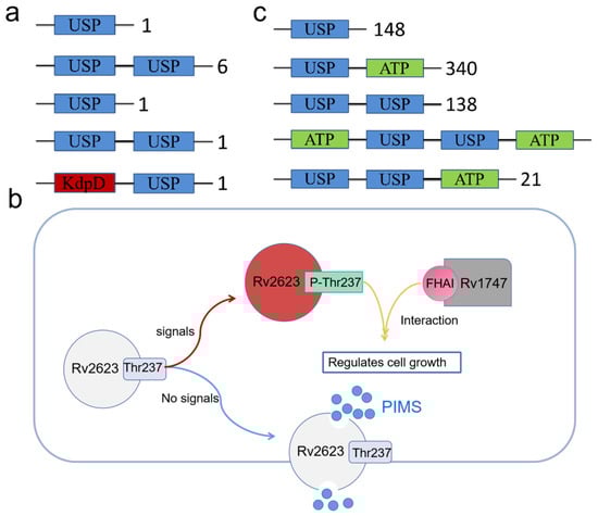 Classification of M. tuberculosis, Vibrio desulfuricans and interaction of Rv2623 with Rv1747. (a) There are ten USPs of Mycobacterium nucleatum, which are classified into five categories. (b) Rv2623 regulates M. tuberculosis growth. When certain signals are present, Rv2623f Thr237 is phosphorylated and interacts with the FHA structure of Rv1747; when there is no signal from Mycobacterium tuberculosis, this protein transports phosphatidylinositol mannoside (PIM), making M. tuberculosis, possess more virulence. (c) Classification of the USP of Vibrio desulfuricans. The USPs can be classified into five categories according to the number of USPs and bound ATPs, i.e., single USP, one USP bound to one ATP, two USPs alone, two USPs connected to one ATP and two ATPs.