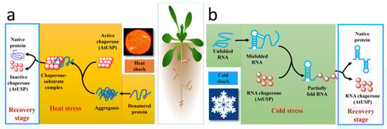 Role of Arabidopsis USPs in different stresses. (a) When the environment gives Arabidopsis high temperature stress, AtUSP functions as a protein chaperone in the cell, it changes from a low molecular weight complex (LMW) to a high molecular compound (HMW) and binds to proteins that cannot function properly because of high temperature aggregation, helping it to restore its active state after AtUSP reverts back to the LMW state. (b) When subjected to cold stress, AtUSP binds as an RNA chaperone to RNA fragments misfolded by low temperature and helps them to open the misfold and restore the correct fold.