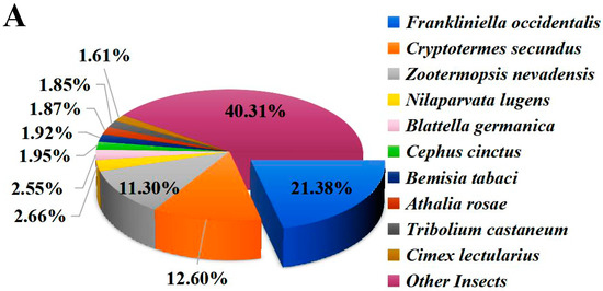The functional annotation of unigenes was performed, including comparison with the NR, Swiss-prot, COG, KOG, KEGG, GO, and Pfam protein databases. The results indicate that 16,788 (43.86%) unigenes were annotated in the above databases (e-value ≤ 1 × 10−5). Among them, 16,697 (43.62%) unigenes matched the NR database (Table 1) and 9397 (24.55%) unigenes are present in three major databases (NR, Swiss-prot, KOG) (Figure S2). Homology analysis with other species in the NR database showed that F. occidentalis, a widely distributed pest thrips, shared the highest identity (21.38%) with O. loti (Figure 1A). In addition, GO annotation was conducted to categorize the function of transcripts, and a total of 6276 unigenes were annotated in three functional groups, namely cellular component, molecular function, and biological process (Figure 1B). In the KEGG annotation, 3478 unigenes were successfully annotated into six types of pathways, among which 714 genes were annotated into “signal transduction” pathways, accounting for 20.53% of the total (Figure 1C).
