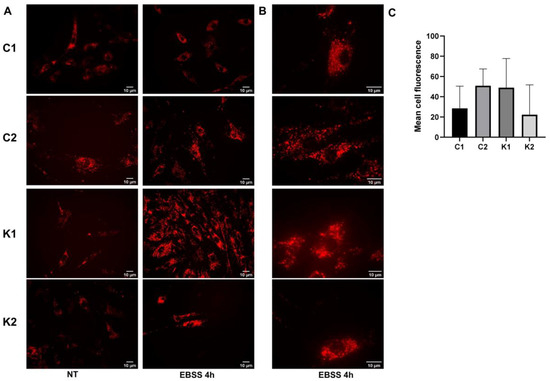 To investigate if lysosomes showed some dysfunctions during starvation-induced autophagy, we stained them using the LysoTracker probe. After 4 h of culture in EBSS, we did not detect any differences in the mean cell fluorescence among the four types of fibroblasts (Figure 4A–C). Examining cells at a higher magnification, we could better appreciate that LysoTracker staining evidenced dot structures in control fibroblasts after EBSS treatment; on the other hand, in KD fibroblasts, fluorescence appeared to be more diffused and possibly related to the phenotype of dilated lysosomes (Figure 4B). We did not detect a specific increase in cathepsin D, LAMP1 and TFEB expression in all fibroblasts during starvation (Figure 4D–F). To better investigate lysosomal functionality, we determined beta-galactosidase and beta-hexosaminidase enzymatic activities before and after 4 h in EBSS. We did not identify any changes except for the increase in both enzymatic activities in Control 1 cells after starvation. Despite that, this evidence was not confirmed in Control 2 cells (Figure 4G). Thus, based on our data, we were not able to identify specific alterations in lysosomal behaviour during autophagy induction in KD fibroblasts.