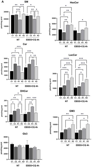 Thus, we can conclude that altered levels of LacCer were the main hallmark in cell sphingolipid profile to distinguish KD fibroblasts from controls before and after autophagy induction by starvation.