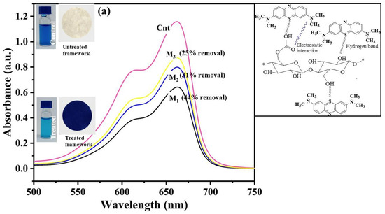 Removal of dyes using functional CNF membranes by direct filtration mode at initial dye concentrations of 10 mg L−1. UV-visible spectroscopy showing a decrease in absorbance of dye after dye removal test versus the control (Cnt) at wavelength λmax = 668 nm for methylene blue (a) and at wavelength λmax = 478 nm for Congo red (b) for membranes fabricated from palm waste (EFB–M or M1), cotton fabric (CF–M or M2), and Whatman filter paper (WFP–M or M3); molecular structure of dyes and their possible interactions with the membranes are shown (right).