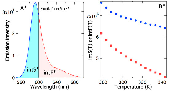 (A) The emission spectrum is divided by excitation line into supracence area (intS) and fluorescence area (intF). Such integrated supracence intensity (blue circles) and integrated fluorescence intensity (red squares) are plotted in (B). Both are plummeting such as the peak maximum S(T) in Figure 4. (C) Quantum yields using the total area under the emission curve ΦT are divided into supracence quantum yield ΦS and fluorescence quantum yield ΦF. (D) After calibrating to variations in quantum yields and extinction coefficients, the normalized integrated intensities for both supracence and fluorescence remain constant as temperature varies. Thus, temperature plays no role in both supracence and fluorescence excitation (n = 0 in Equation (3)).