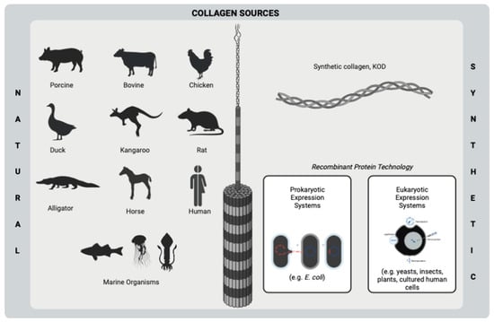 Collagen is a fibrous, insoluble protein that is the main component of the extracellular matrix (ECM) of several tissues [] of humans and many animals, such as bone [], cartilage [], tendon [], skin [], and muscle []. A natural biopolymer, collagen is one of the most abundant proteins in mammals [] and becomes prominent among the other polymers due to its superior and distinct properties. Excellent biocompatibility, good biodegradability, hydrophilicity, remarkable mechanical properties, low or no antigenicity, hemostatic properties, and cell-binding ability are some of the important features of collagen, which make it important for many biomaterial applications, such as tissue engineering and drug delivery purposes [,,,]. On the other hand, the resistance of collagen to bacteria makes it outstanding to use in the development of antimicrobial biomaterials for many kinds of applications, such as the treatment of wounds and bone infections. Owing to its natural ability to fight infection, collagen contributes to keeping the infection site sterile [,]. Moreover, collagen has very high availability since its abundance in mammals and marine organisms as well as its producibility from yeasts, plants, insects, and mammal cells by recombinant protein technology [,] (Figure 1). Despite its proven properties, collagen-based biomaterials need to incorporate bioactive molecules such as antibiotics and plant-based agents in order to increase their biological activities.