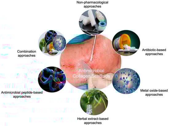 In response, a variety of clinical interventions have been employed to combat AMR-related diseases, including the use of combination therapies, strategies aim targeting antimicrobial-resistant enzymes or bacteria, longer treatment durations, and off-label uses [,]. Despite these efforts, the development of new and effective antimicrobials has been slow, and the emergence of resistance to these interventions has become incremental. Furthermore, some of these interventions come with their drawbacks, such as an increase in side effects, higher medicinal costs, and longer hospital stays []. As such, there is a clinical need for alternative approaches such as biomaterial-based strategies to combat antimicrobial resistance and promote the development of more effective therapies. The various antimicrobial collagen biomaterial strategies have recently come to the fore in the literature within this framework.