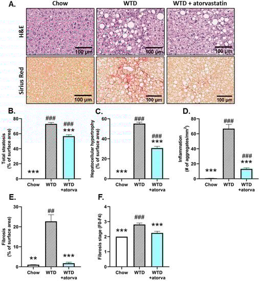 Histological photomicrographs and quantitative analysis of NASH parameters. APOE*3-Leiden mice were fed a Western-type diet (WTD) with (n = 16) or without (n = 16) atorvastatin admix for 32 weeks. Chow-fed mice (n = 10) were included as a healthy reference. Representative histological photomicrographs of H&E-stained and Sirius Red-stained liver cross-sections (A). Total steatosis (B) and hepatocellular hypertrophy (C) as percentage of surface area, number of inflammatory foci per mm2 microscopic field (D), fibrosis as percentage of surface area (E) and fibrosis stage (F0–F4) (F) were determined at the study endpoint (t = 32 weeks) and are presented as mean ± SEM. ** p < 0.01, *** p < 0.001 vs. WTD. ## p < 0.01, ### p < 0.001 vs. chow.