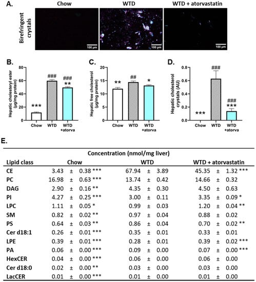 Atorvastatin decreases hepatic cholesterol content and strongly reduces formation of cholesterol crystals in the liver. APOE*3-Leiden mice were fed a Western-type diet (WTD) with (n = 16) or without (n = 16) atorvastatin admix for 32 weeks. Chow-fed mice (n = 10) were included as a healthy reference. Representative photomicrographs of liver cryosections showing birefringent cholesterol crystals (A). Hepatic cholesteryl ester (B), free cholesterol (C), cholesterol crystal content (D) and hepatic concentrations of lipid species that were significantly altered in WTD-fed mice compared to chow-fed mice (E) were determined at the study endpoint (t = 32 weeks) and are presented as mean ± SEM. * p < 0.05; ** p < 0.01; *** p < 0.001 vs. WTD; ## p < 0.01; ### p < 0.001 vs. chow. CE, cholesteryl ester; Cer, ceramide; DAG, diglyceride/diacylglycerol; HexCER, hexosylceramide; LacCer, lactosylceramide; LPC, lysophosphatidylcholine; LPE, lysophosphatidylethanolamine; PA, phosphatidic acid; PC, phosphatidylcholine; PI, phosphatidylinositol; PS, phosphatidylserine; SM, sphingomyelin.