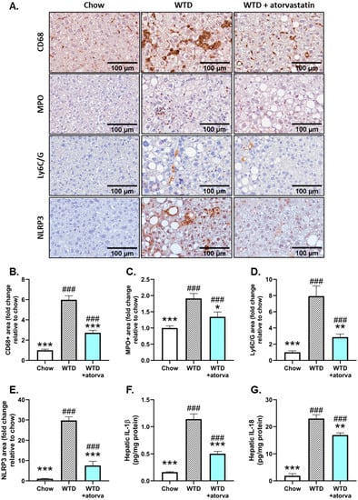 To investigate the background of this decreased infiltration of innate immune cells and since previous studies have shown that cholesterol crystals are potent inducers of the NLRP3 inflammasome [,] and were shown here to be strongly reduced by atorvastatin, we investigated whether atorvastatin affected activation of the NLRP3 inflammasome pathway by measuring hepatic NLRP3 expression and expression of IL-1β and IL-18. Immunostaining of liver tissue for NLRP3 revealed a strong increase in the positively stained area in WTD-fed mice compared to chow-fed mice (Figure 3A,E) that induced in the downstream a 6.8-fold increase in hepatic IL-1β protein levels and 11.1-fold increase in hepatic IL-18 protein levels (Figure 3F,G). The reduced formation of hepatic cholesterol crystals in atorvastatin-treated mice prevented the rise in hepatic NLRP3 expression (Figure 3E). The consequent lowering of pro-inflammatory cytokine concentrations (−61% for IL-1β and −26% for IL-18) (Figure 3F,G) emphasizes the beneficial effects that atorvastatin exerts on hepatic inflammation and further supports its proposed effect on NLRP3 inflammasome activation.