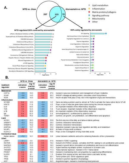 To further explore the anti-inflammatory effects of atorvastatin in the liver, transcriptome analysis was performed to identify pathways and upstream (master) regulators that were differentially expressed in statin-treated mice compared to untreated WTD-fed mice. The WTD induced differential expression of 390 pathways compared to APOE*3-Leiden mice on the healthy chow diet (Figure 4A, Venn diagram, white circle). Compared to untreated WTD mice, atorvastatin modulated 154 differentially expressed pathways, of which the majority overlapped with pathways that were induced by the WTD (Figure 4A, Venn diagram, blue circle). Of this overlapping portion of the Venn diagram, the top 15 most significantly enriched pathways that were induced by the WTD but reversed with atorvastatin were mainly involved in lipid metabolism, but also acute phase response signaling and hepatic fibrosis/hepatic stellate cell activation (Figure 4A). The top 15 differentially expressed pathways solely regulated by atorvastatin reveal a diverse list that includes pathways involved in lipid metabolism, mitochondrial pathways and several different degradation pathways (Figure 4A).