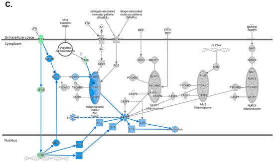 Further analysis revealed substantial changes in the hepatic lipidomics profile induced by WTD-feeding. A different study by Ooi et al. showed differences in the lipidomics profile of bariatric patients without NAFLD-NASH and with either NAFLD or NASH, and reported considerable changes in hepatic levels of various lipid species with increasing NAFLD-NASH severity []. Because no differences were found in the hepatic lipidomics profile of patients with NAFLD and patients with NASH, the authors suggest that changes in the hepatic lipidome likely present themselves in the early stages of NAFLD development. While a few studies have reported on changes in the hepatic lipid concentrations of healthy subjects when compared with NAFLD or NASH subjects, none of these studies make a clear distinction in which medication to use. Our data demonstrated that intervention with atorvastatin had significant normalizing effects on hepatic lipid concentrations. The APOE*3-Leiden mouse model on a WTD may be less suitable to evaluate the effects of atorvastatin on hepatic triglyceride content, since concentrations in chow-fed mice and WTD-fed mice were comparable (123.7 ± 19.3 in chow vs. 152.1 ± 11.3 nmol/g liver in WTD fed animals; which was not significant). At the transcriptional level, we discerned that atorvastatin downregulated the expression of genes involved in inflammatory pathways including TLR4, MyD88 and NFκB. The additional Ingenuity Pathway Analysis-predicted inhibition of other relevant genes in the NLRP3 inflammasome pathway by atorvastatin confirms the significance of atorvastatin in preventing an inflammatory response. Together, these data demonstrate in detail the beneficial effects of atorvastatin on hepatic lipid content as well as on hepatic inflammation.