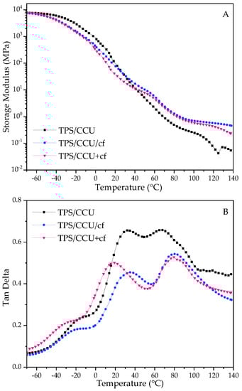DMTA results for TPS films. Storage modulus for TPS with CCU—(A) and for TPS with BU—(C) and tanδ for TPS with CCU—(B) and for TPS with BU—(D).