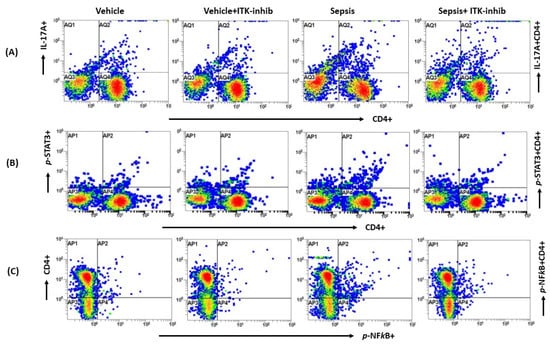 Next, we wanted to explore whether Th17-related immune responses are controlled by ITK signaling in periphery and the CNS, and whether the BMS compound is able to attenuate them. Our data show that IL-17A, p-STAT3, and p-NFkB are elevated in CD4+ T cells in the periphery as depicted by the % of IL-17A+ CD4+ T cells, p-STAT3+ CD4+ T cells, and p-NFkB+ CD4+ T cells (Figure 2). Sepsis-induced elevation in the Th17-related parameters were attenuated by the ITK inhibitor in the periphery (Figure 2).