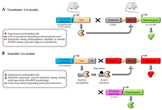 Most in vivo studies focus on CVD pathophysiology and use models that mimic the main features of the disease being studied. However, in those animal models, it is rarely possible to follow the fate of EC. The strategies used are, therefore, the same as in vitro, i.e., demonstrating the coexpression of mesenchymal and endothelial markers or changes in cell morphology. With the aim of better characterizing the role of EndMT in cardiac fibrosis and other CVD pathologies, lineage-tracing animal models have been progressively developed and used. These models have provided additional insights into the EndMT process. These models are summarized in Figure 2.